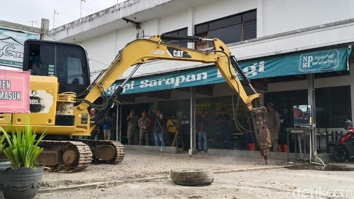 Untuk meratakan bangunan-bangunan liar, petugas mengerahkan 2 unit alat berat. Bangunan pertama yang dibongkar adalah sebuah lantai beton di depan kafe, yang menutup saluran irigasi.