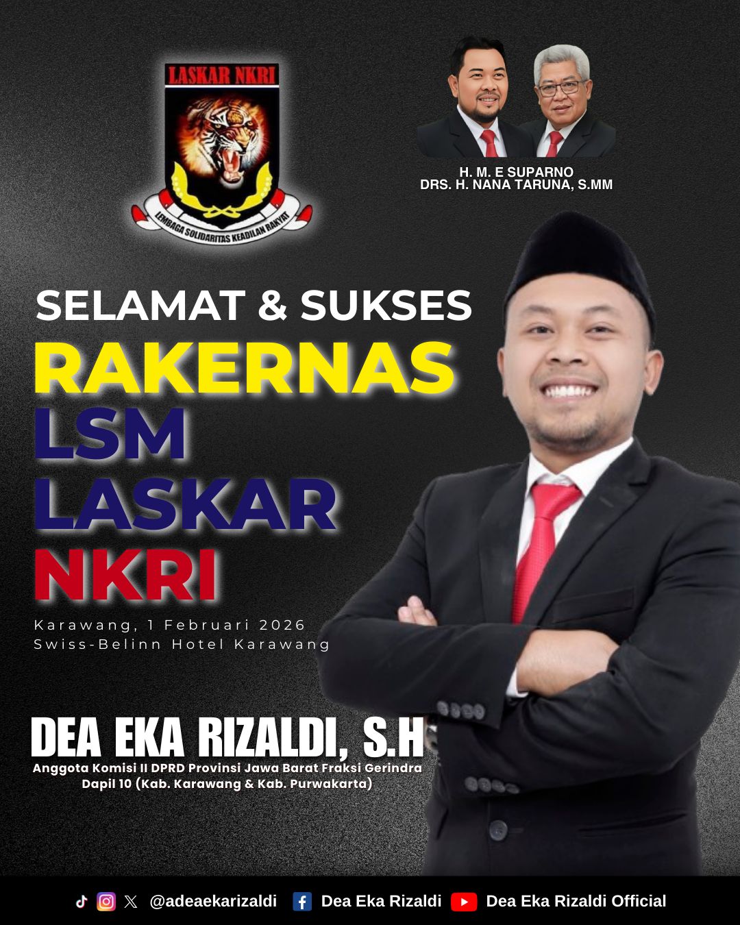 Karawang|Sejagatnews|Anggota DPRD Provinsi Jawa Barat, Dea Eka Rizaldi, menghadiri Rapat Kerja Nasional (Rakernas) LSM Laskar NKRI yang digelar di Swiss-Belhotel Karawang, Minggu (1/2/2026).